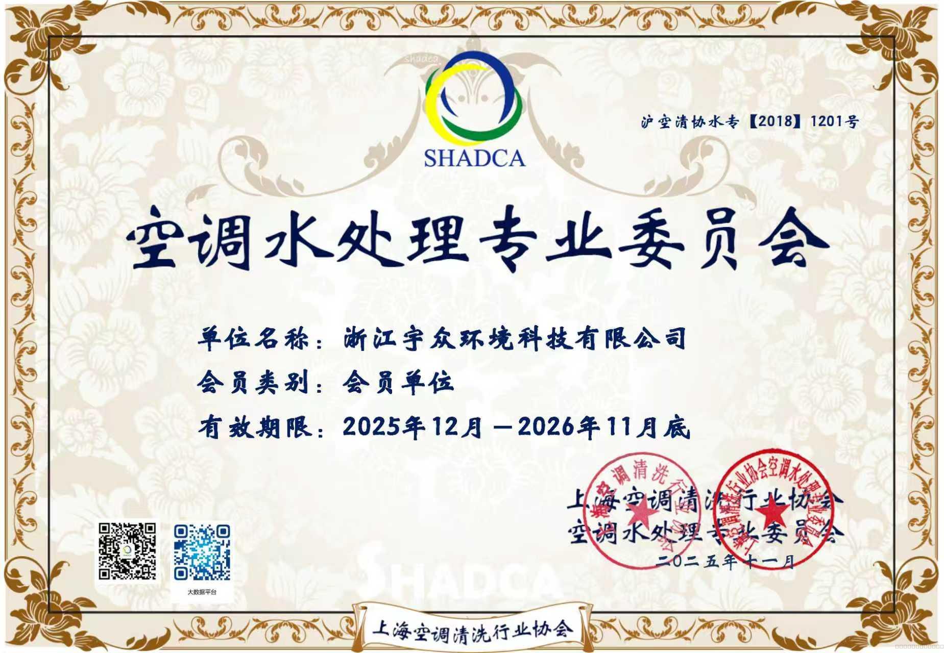 上海冷冻空调行业协会团体会员证书